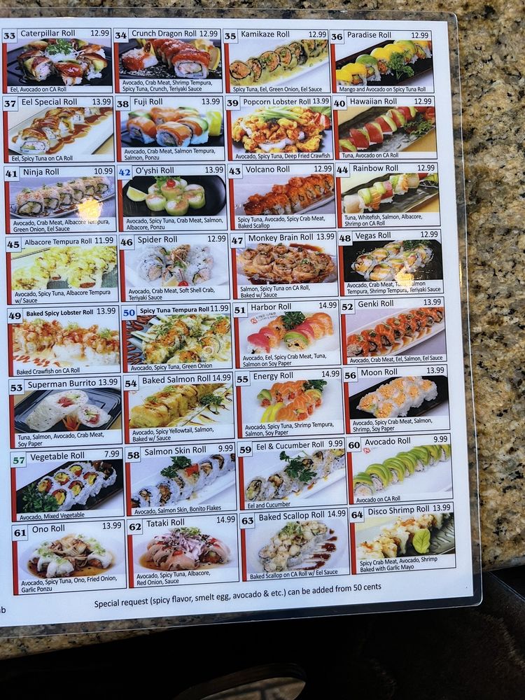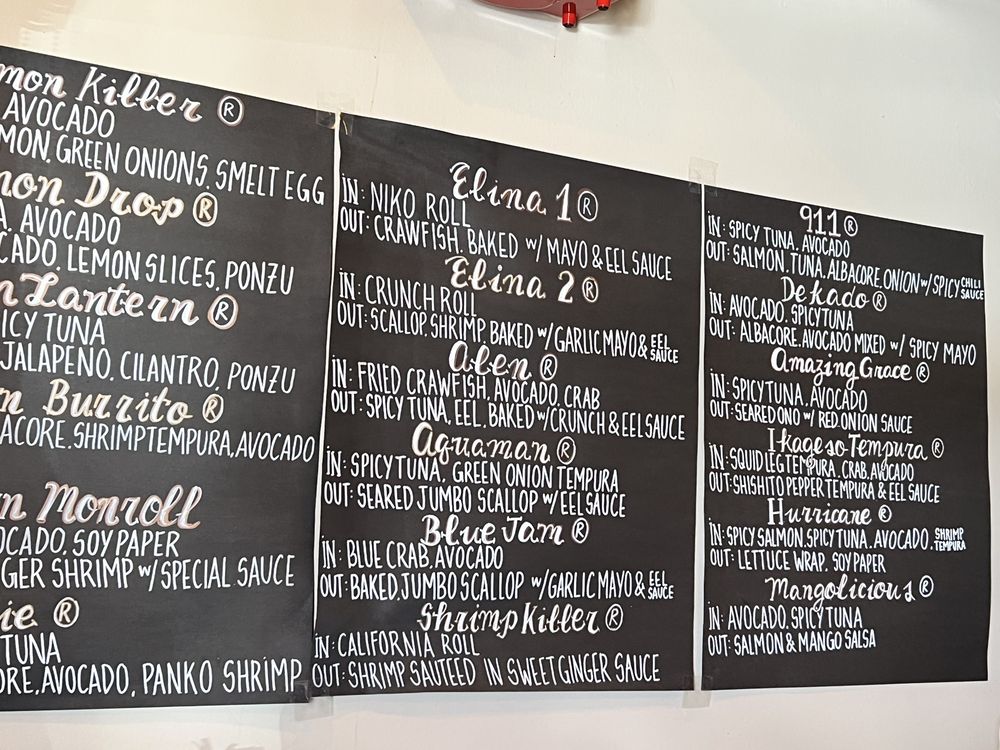 In: spicy tuna, avocado out: salmon, tuna, whitefish, red onions mixed w/ spicy chili sauce